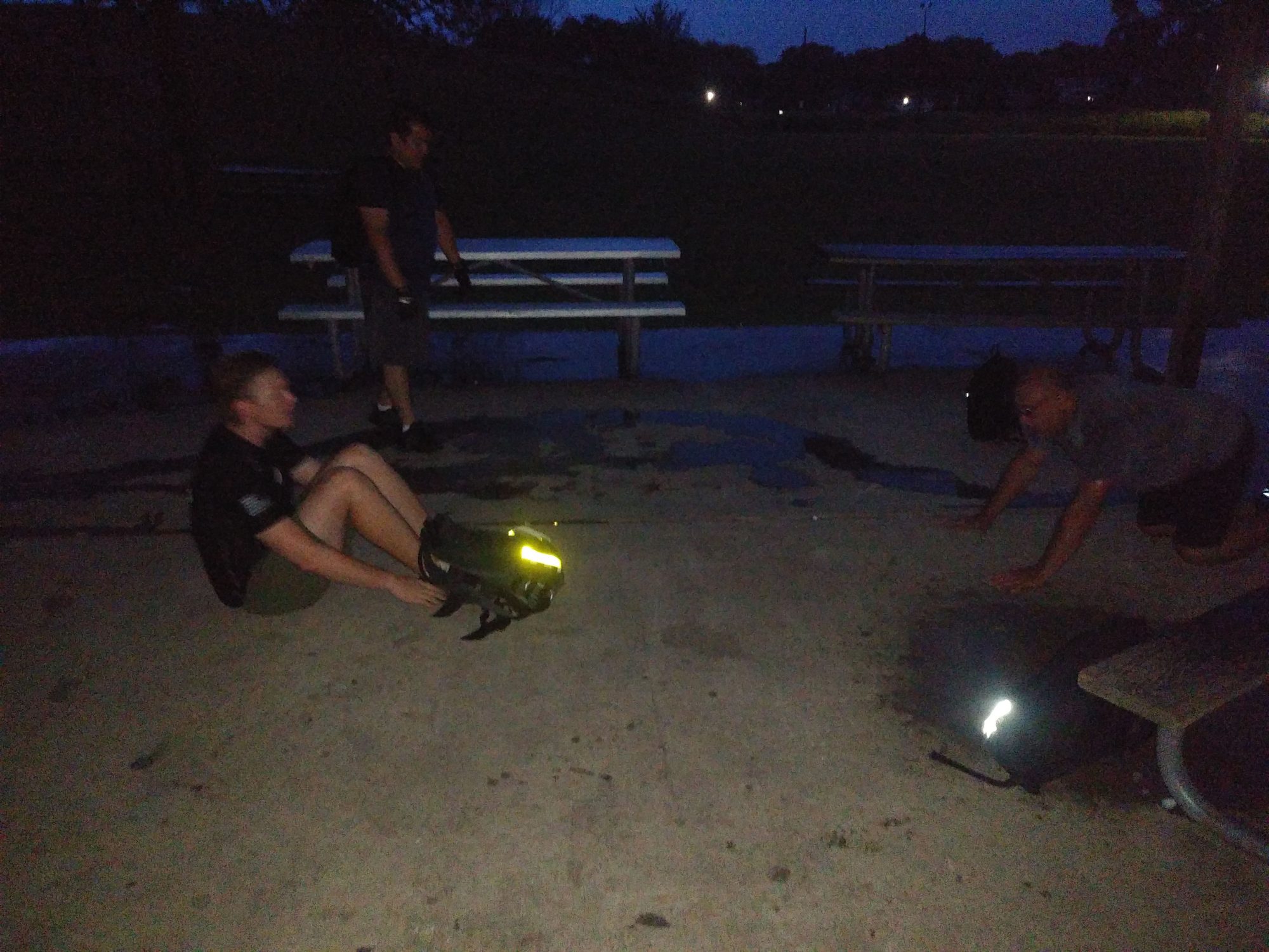 In the early grey of a gloomier than normal morning, 4 PAX (Triple XXX, Noodles, Archive, Crunch) met to complete the final workout for the month. As the rain made up its mind, they moseyed around in the rain until lightning stationed them under the pavilion for the remainder of the workout.