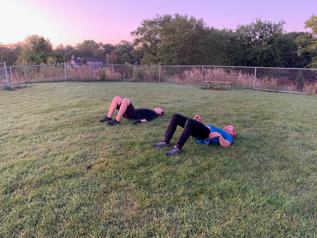 Warm Up; We jogged around playground hill area; doing butt kicks, high knees, and karaoke. Archive was perplexed by such a low key warm up, but after all it is a warm up and it is a bit early in the morn. Were no spring chickens anymore.