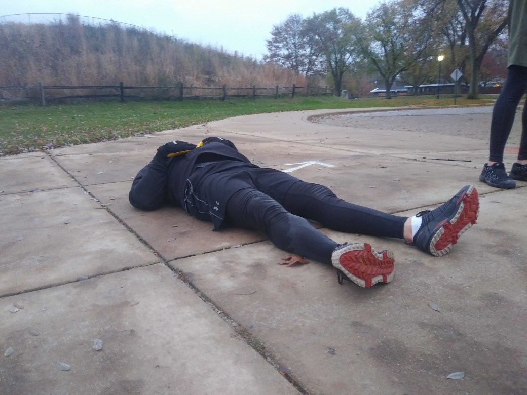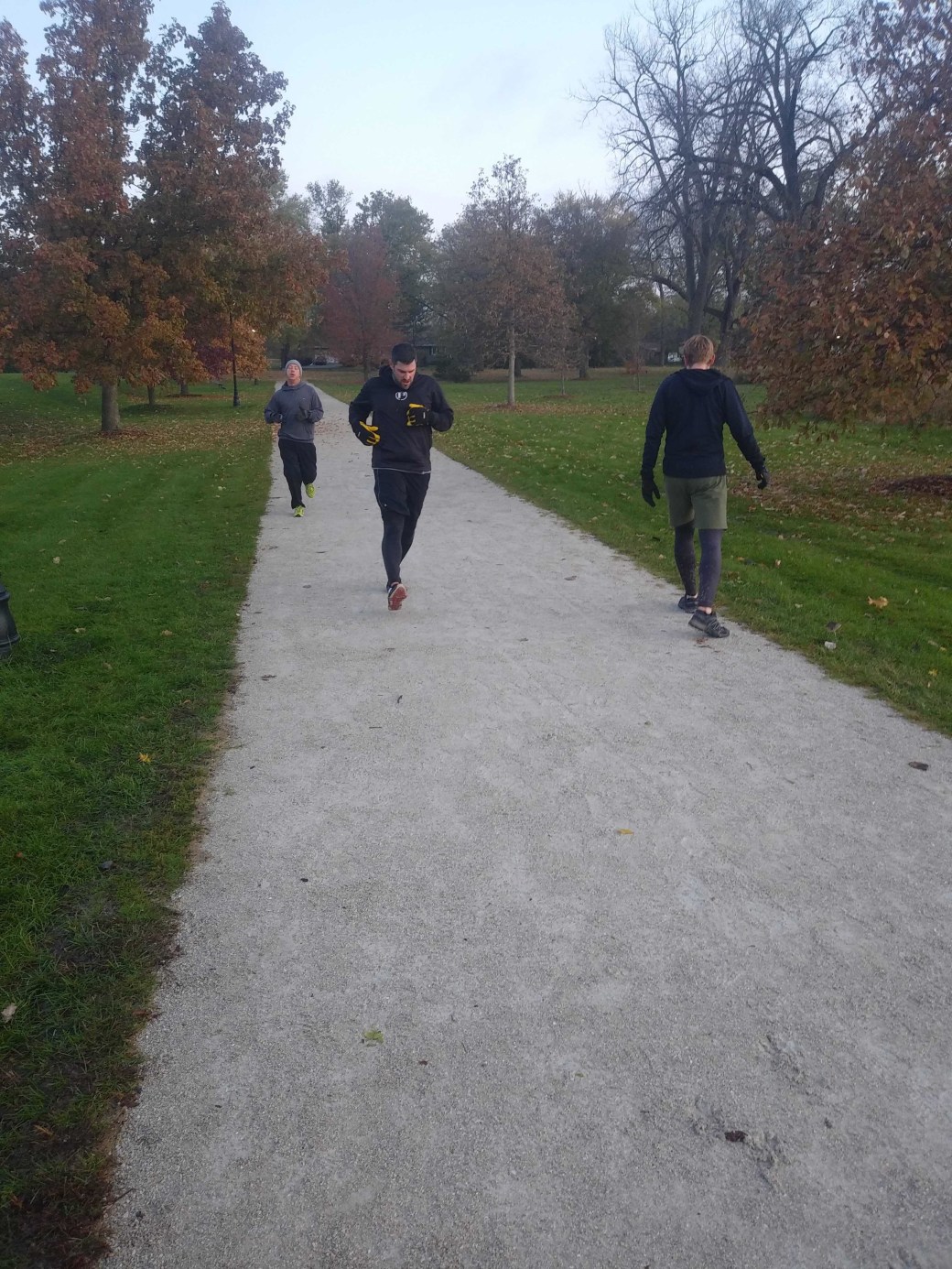 *They saw* – A fun filled hour of physical achievement. We utilized the jogging paths starting out on the Archive mile and then worked our way around the inner loop (not sure if that route is named after anyone yet). The structure of the workout was to do a 2 minute light jog then stop and do 2 minutes AMRAP of a specified exercise and ending each stop with 5 burpees. Also if we were to pass anyone on the path we were to stop and do 10 mountain climbers. This only happened twice and it was the same person both times (she was just jogging the same route we were but in reverse)