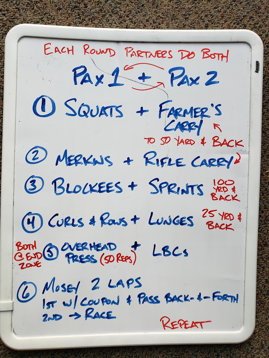 6. mosey 2 laps (1st lap w/1 coupon to pass back-and-forth // 2nd lap run/race)