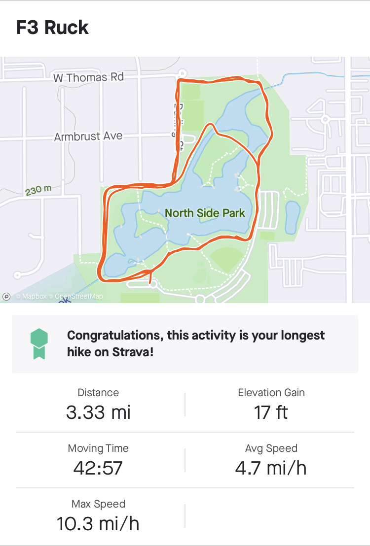 We Rucked, we ran. Ruckers got in 3.33 miles which is a personal best for 45 minutes for at least one PAX. Some of the runners came early for a “warm up mile” EC and logged north of 6 miles.