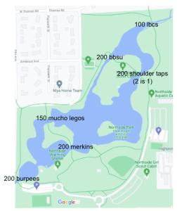 10. Any team that is not at the flag by 6:15:00 by my watch surrenders all of their points. Anyone who arrives at the flag early holds plank or canoe under penalty of losing points (some or all) for your team.