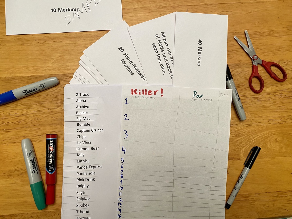 - When one name remains on your list, that’s the killer. Run back to the flag and write your guess on the paper attached to the flag. Each pax has one guess per game. If you are the first team to correctly guess the killer, you win.