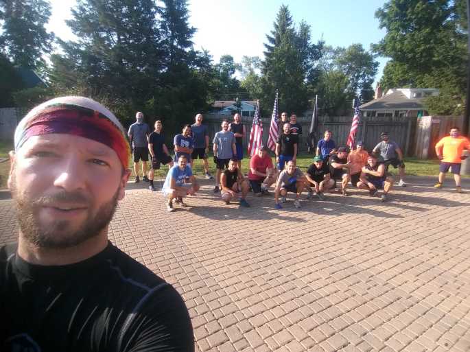 1 PAX does the following set: 5x Burpee Power Clean, 10x Clean and Press, 15x Shoulder to Shoulder Thruster. While PAX completes the set, 1 PAX AMRAP BBSitups, other PAX lunges. PAX run to other partner at completion of the set and switch roles. Rinse, repeat until all PAX in group have done sandbag set.