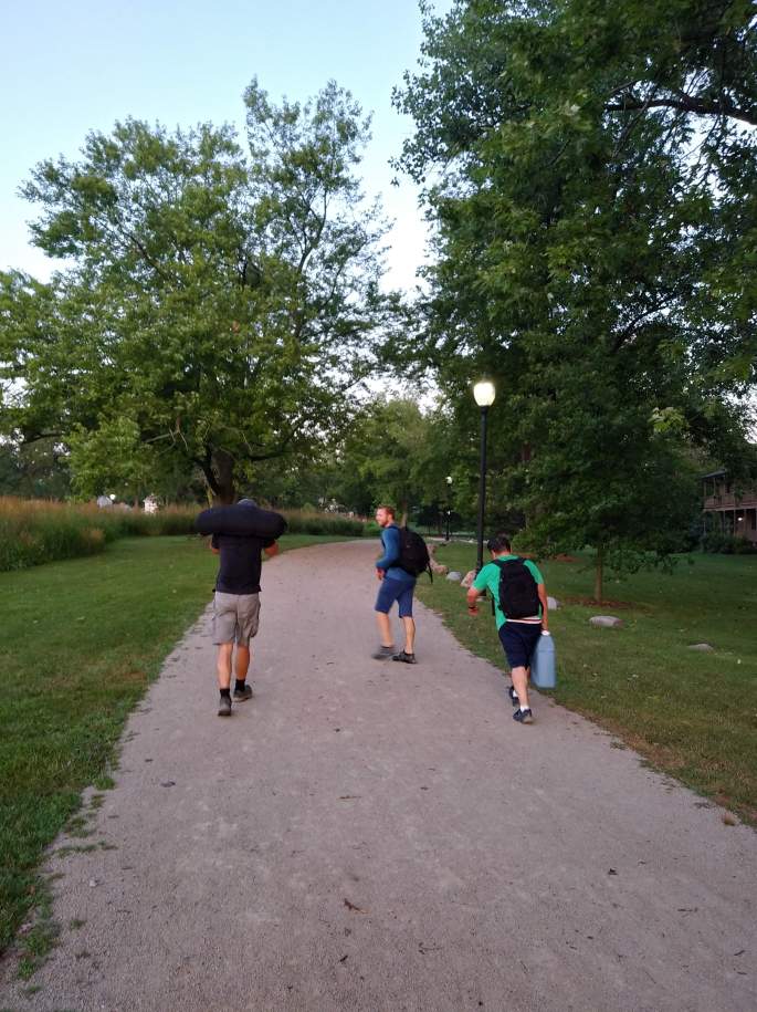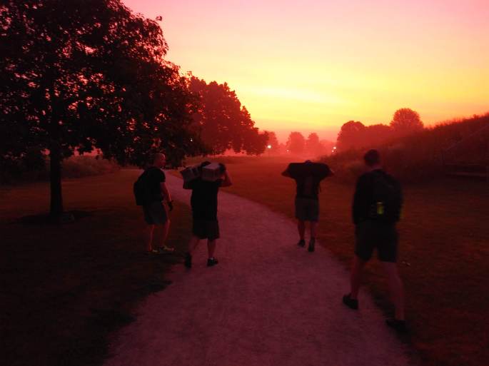 Having received intelligence of a potential large object that could be “returned” to the dig-site of our mascot, we made a quick detour to try our strength against a discarded remnant of Perry (a broken chunk of telephone pole). While our heart was in the attempt, and even as the best among us were digging deep to soldier on at all costs, we ultimately saw wisdom less than 200 yards later. Nails, bulk, and the inability to get enough men underneath the load convinced us to let Perry repose in the Gloom only slightly nearer to our destination than before. We did however manage to bring a considerably smaller but no less symbolic relic of Perry along with us, and traded off carrying the more manageable load.